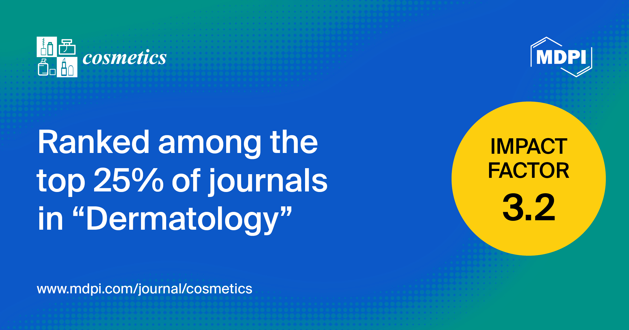 We are pleased to share that Cosmetics (ISSN: 2079-9284) was awarded an updated Impact Factor of 3.2 in the 2024 Journal Citation Reports™ released by Clarivate™ in June 2025. Cosmetics ranks in Q1 (22 among 96 titles) in the “Dermatology” category.
