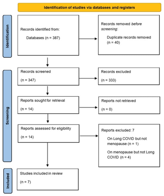 Background: According to the National Institute for Health and Care Excellence (NICE), long COVID refers to symptoms persisting for four weeks or more after acute infection, with over 100 identified, including fatigue, cognitive dysfunction, and breathlessness. Women aged 45–54 are disproportionately affected, overlapping with the typical age for perimenopause and menopause. This scoping review aimed to provide an overview of existing research on the intersection between long COVID and the menopausal transition. Methods: Five database (CINAHL ultimate, MEDLINE, ScienceDirect, Cochrane, and Scopus) searches yielded 387 articles; after removing 40 duplicates and screening 347 titles and abstracts, fourteen studies were reviewed in full, with seven meeting the inclusion criteria (examined both long COVID and menopause in their scope and are written in English language). Results: This scoping review identified a significant symptomatic overlap between long COVID and menopause reported by participants, particularly fatigue, cognitive difficulties, mood changes, and sleep disturbances. Preliminary evidence also suggests that hormonal fluctuations may influence symptom severity, though biological mechanisms remain insufficiently understood. Methodological limitations restrict generalisability, underscoring the need for longitudinal symptom tracking, diverse samples, and biomarker-informed studies. Recognising the intersection of long COVID and menopausal transition is essential for improving assessment, management, and targeted care for affected women.