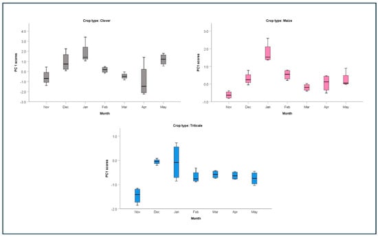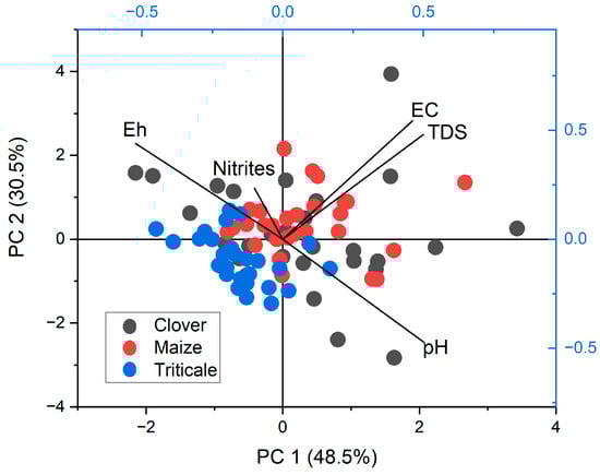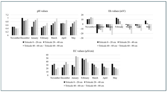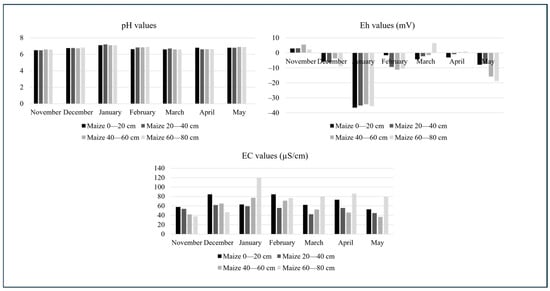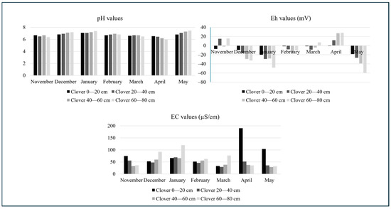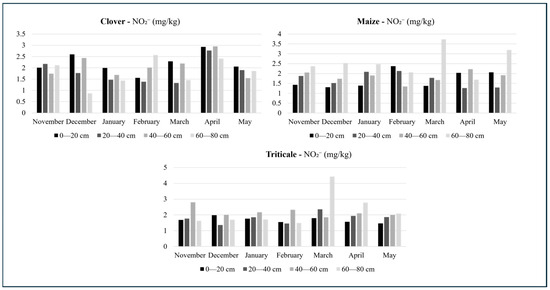 The regulation of nutrient availability and microbial processes in agroecosystems are strongly mediated by soil physico-chemical factors. Yet, their seasonal dynamics in different crops are not fully understood. This study monitored pH, redox potential (Eh), electrical conductivity (EC), and nitrite (NO2−) in soils grown with clover, maize, and triticale from November to May. Monthly samples were collected in four depth layers (0–20, 20–40, 40–60, 60–80 cm) and analyzed to reveal patterns over time and space. Soil pH remained near neutral, with slight decreases in spring, and it appeared that maize maintained more stable values than clover or triticale. Eh was highest in winter, indicating oxidizing conditions, but decreased in spring, especially at depth under triticale. EC showed moderate variation, with higher surface values under maize. NO2− was uniformly low in winter but increased in spring, especially in deeper soils with triticale, while clover had lower accumulation. Overall, clover supported greater soil stability, maize increased surface EC, and triticale enhanced nitrite accumulation at depth. These results highlight the need for crop-specific, depth-aware management to maintain soil quality and optimize nitrogen cycling in agricultural systems.