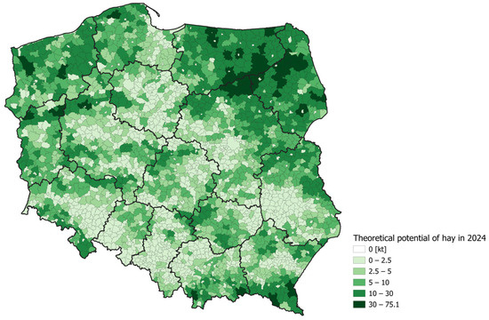 This study presents a comprehensive methodology for assessing the technical potential of hay biomass from permanent grasslands (TUZ) in Poland, aimed at evaluating its energy use possibilities. This research was based on detailed data from the Agency for Restructuring and Modernization of Agriculture (ARiMR) and included both environmentally subsidized and non-subsidized parcels. Using statistical hay yield values adjusted for drought impacts through the Climatic Water Balance (KBW), a realistic estimation of technical hay potential was obtained. Results show a total theoretical hay potential of 15 million tonnes in 2024. The results indicate that the total theoretical hay potential in the country in 2024 amounted to 15 million tons, but its technical potential is reduced to almost zero. The methane productivity of this biomass could generate 3.5 Mt CH4 (at STP) if most of it could not be used for animal feeding purposes. The findings highlight the underutilized energetic potential of grasslands and the critical role of land use policy in unlocking sustainable bioenergy resources. Research into the potential of biomass is important in view of supporting energy independence, sustainable use of agricultural resources and agroecological synergy by combining production, energy and environmental objectives. It should be remembered that biomass potential studies are subject to limitations resulting from the uncertainty of statistical data, variability of climatic and soil conditions and model assumptions, which may affect the accuracy and comparability of the obtained results.