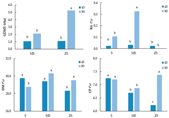 This study aimed to determine the optimal combination of forage grass and row spacing to maximize the balance between sorghum silage yield and quality in a simultaneous sowing system for integrated crop-livestock production. The experiment evaluated three cropping systems: biomass sorghum (Sorghum
