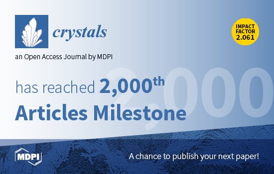 We are pleased to announce that Crystals has passed the milestone of having published 2000 papers since its inception in 2011. Crystals (ISSN 2073-4352) is an open access journal published monthly online by MDPI that covers all aspects of crystalline material research, including liquid crystals and biomolecular crystals. It is now covered in the Science Citation Index Expanded (Web of Science) and Scopus, with a 2018 Impact Factor of 2.061, which corresponds to the rank 12/26 (Q2) in Crystallography.
