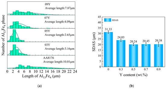 In Al–Fe alloys, the mechanical properties are determined by the morphology of iron-rich phases. In this work, AA8176(Al-1Fe)-nY (n = 0, 0.3, 0.5, 0.7, and 0.9 wt.%) alloys were prepared by the cast method. The effects of yttrium (Y) addition on the microstructure and mechanical properties of AA8176 alloy were studied using various techniques including optical microscopy (OM), scanning electron microscopy (SEM), transmission electron microscopy (TEM), X-ray diffraction (XRD), cooling curve analysis and tensile tests. The results revealed that the optimal refinement effect was achieved when the amount of Y content was 0.5 wt.%. When the Y content increased from 0 to 0.5 wt.%, the coarse needle-like Al13Fe4 phases were gradually transformed into short rod-like morphology and some fine Al10Fe2Y phases were formed around the Al13Fe4 phases. The average length of iron-rich phases was decreased from 10.01 μm to 2.65 μm. Additionally, as the Y content increased from 0 to 0.5 wt.%, the secondary dendrite arm spacing (SDAS) of AA8176 alloy was reduced from 31.33 μm to 20.24 μm. Furthermore, the mechanical properties of the AA8176 alloy were improved due to the modified microstructure. With the addition of 0.5 wt.% Y, the ultimate tensile strength, yield strength, elongation, and Vickers hardness were improved to 96.86 MPa, 57.21 MPa, 23.1%, and 30.55 HV, respectively, compared to 84.47 MPa, 50.71 MPa, 18.6%, and 27.28 HV for the unmodified AA8176 alloy. It is proposed that the growth of α-Al dendrite and Al13Fe4 phases were effectively inhibited by segregation of Y atoms around α-Al dendrite and Al13Fe4 phases during solidification. And the Al10Fe2Y phases were formed by these Y atoms with Al and Fe elements. However, the formation of coarse Al10Fe2Y phases was promoted by excessive Y content, resulting in a substantial degradation in mechanical properties.