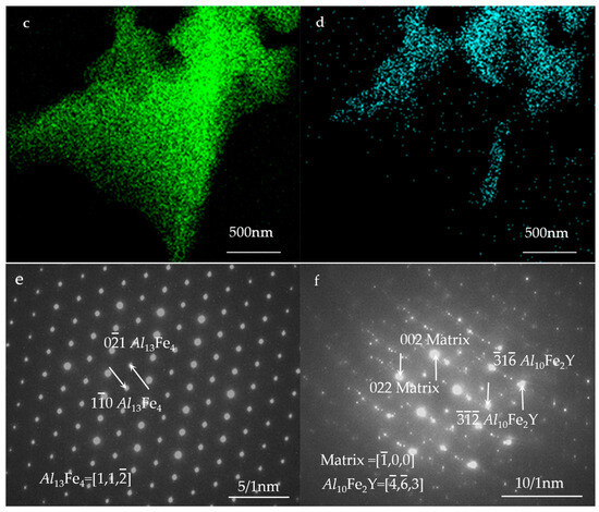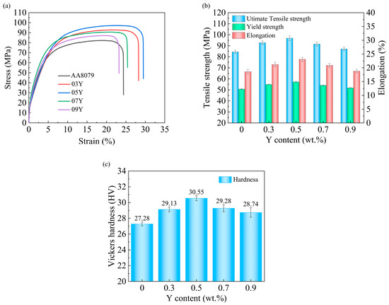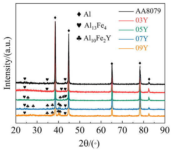 In Al–Fe alloys, the mechanical properties are determined by the morphology of iron-rich phases. In this work, AA8176(Al-1Fe)-nY (n = 0, 0.3, 0.5, 0.7, and 0.9 wt.%) alloys were prepared by the cast method. The effects of yttrium (Y) addition on the
