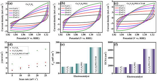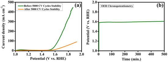 The electrochemical water splitting process represents a promising and sustainable route for generating high-purity hydrogen with minimal environmental impact. The development of efficient and economically viable electrocatalysts is crucial for enhancing the kinetics of the oxygen evolution reaction (OER), which is a major bottleneck in overall water splitting. In this study, a Co3V2O8/PEG-CTAB electrocatalyst was synthesized and systematically evaluated for its OER activity in alkaline conditions. The nanosheet-like architecture of the PEG-CTAB-assisted Co3V2O8 electrocatalyst facilitates effective interfacial contact, thereby improving charge transport and catalytic accessibility. Among the examined compositions, the Co3V2O8/PEG-CTAB catalyst exhibited superior OER performance, requiring a low overpotential of 298 mV to deliver a current density of 10 mA cm−2 and displaying a Tafel slope of 90 mV dec−1 in 1 M KOH. Furthermore, the catalyst demonstrated outstanding durability, retaining its electrocatalytic activity after 5000 consecutive CV cycles and prolonged chronopotentiometric testing. The Co3V2O8/PEG-CTAB || Pt-C asymmetric cell required a cell voltage of 1.83 V to reach the threshold current density, confirming its ability to efficiently sustain overall water splitting under alkaline conditions. The enhanced performance is attributed to the synergistic effect of the electrocatalyst, which promotes active site exposure and structural stability. These findings highlight the potential of the Co3V2O8/PEG-CTAB system as a cost-effective and robust electrocatalyst for practical water oxidation applications.