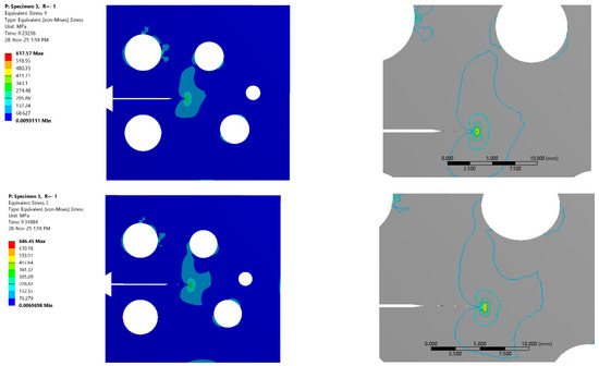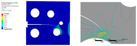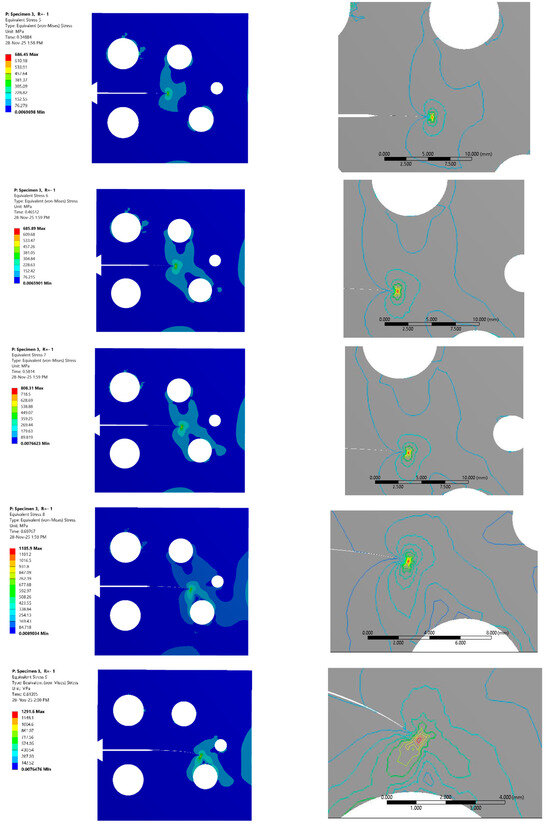 This paper presents a high-fidelity numerical simulation of curvilinear fatigue crack growth (FCG) through a modified Compact Tension (CT) specimen made of Haynes 230 nickel-based superalloy. The specimen’s design, featuring three extra holes, was intentionally chosen to induce mixed-mode loading and complex, non-linear crack paths. Crucially, this configuration allows for a thorough examination of how the specimen’s geometry, restraints, or minor manufacturing discrepancies affect the localized stress state. Experimental data corresponding to three different initial crack patterns were utilized to validate the numerical model implemented within the ANSYS simulation environment. The comparison demonstrated that the present simulated crack trajectory was significantly closer to the experimental results than those obtained from earlier numerical simulations using ZFEM-TERF and FRANC3D. Furthermore, the current study critically examined the validity of Linear Elastic Fracture Mechanics (LEFM) by analyzing the evolution of the Cyclic Plastic Zone (CPZ) size for two distinct stress ratio values: R = 0.5 and R = −1. The findings confirm the full satisfaction of the Small-Scale Yielding (SSY) criterion throughout the crack growth history for the positive stress ratio (R = 0.5). Conversely, the negative stress ratio (R = −1) caused a significant violation of the SSY assumption in the later stages of propagation. This highlights how the applicability of LEFM is largely dependent on the loading regime and underscores the necessity of employing Elastic–Plastic Fracture Mechanics (EPFM) for fully reversed cycles. This research establishes a well-founded and valuable protocol for predicting Fatigue Crack Growth (FCG) in complex superalloy components.