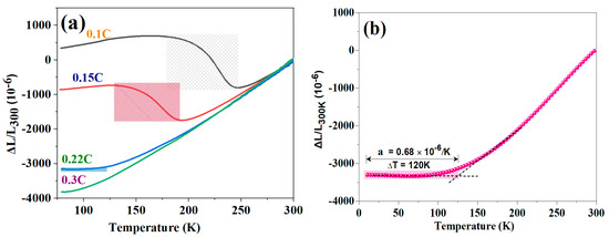 An attractive cryogenic near-zero thermal expansion (ZTE) behavior was achieved in the Mn3Cu0.5Ge0.5N0.78C0.22 compound, spanning a broad temperature window of 120 K (5 K to 125 K) with an average coefficient of thermal expansion (CTE) of α = 0.68 × 10−6 K−1. Furthermore, the effect of sintering temperature and holding time on thermal expansion and magnetic properties were investigated. Two distinct magnetic phase transitions are evident in the magnetization–temperature (M-T) curve of Mn3Cu0.5Ge0.5N0.78C0.22, which precede the near-ZTE behavior. These two antiferromagnetic (AFM)-like ordering transitions are hypothesized to play a pivotal role in governing the ZTE behavior, as they induce two episodes of negative thermal expansion (NTE). The realization of ZTE behavior is thus attributed to the counterbalance of these two NTE contributions, which can be effectively tuned by varying the carbon content or optimizing the sintering process parameters. Collectively, these results demonstrate significant potential for the design of diverse cryogenic functional materials.