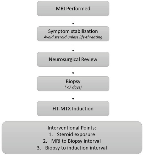 Primary central nervous system lymphoma (PCNSL) is an aggressive malignancy for which early management decisions frequently occur within neurosurgical workflows prior to oncologic treatment. In this retrospective single-center study, we aimed to explore whether early neurosurgical workflow characteristics are associated with survival outcomes in patients with PCNSL. Consecutive adult patients diagnosed with PCNSL between 2012 and 2022 were included, and the variables of interest comprised pre-biopsy corticosteroid exposure, the interval between diagnostic magnetic resonance imaging (MRI) and stereotactic biopsy, and the time from biopsy to initiation of high-dose methotrexate–based induction therapy. All patients were treated under a standardized hematology protocol to limit systemic treatment heterogeneity. Overall survival (OS) and progression-free survival (PFS) were calculated from the date of diagnostic biopsy, and survival analyses were performed using Kaplan–Meier methods and log-rank testing. Twenty-nine patients met the inclusion criteria. Median OS and PFS were not reached in steroid-naïve patients, whereas pre-biopsy corticosteroid exposure was associated with consistently shorter survival trajectories, with a clear separation of the survival curves, despite conventional statistical significance not being reached. Similarly, median OS and PFS were not reached in patients undergoing biopsy within 7 days of MRI, and an MRI-to-biopsy interval exceeding 7 days demonstrated an unfavorable survival trajectory compared with earlier biopsy; biopsy-to-induction timing did not show a measurable association with early survival outcomes. Established prognostic stratification using Memorial Sloan–Kettering Cancer Center classes showed expected survival discrimination within the cohort, supporting internal validity. Given the limited sample size and retrospective design, all findings should be interpreted as exploratory associations rather than evidence of causality. These results suggest that early neurosurgical workflow characteristics, particularly empiric pre-biopsy corticosteroids avoidance and diagnostic delay minimization, may be associated with early survival trajectories in PCNSL and warrant further evaluation in larger prospective studies.