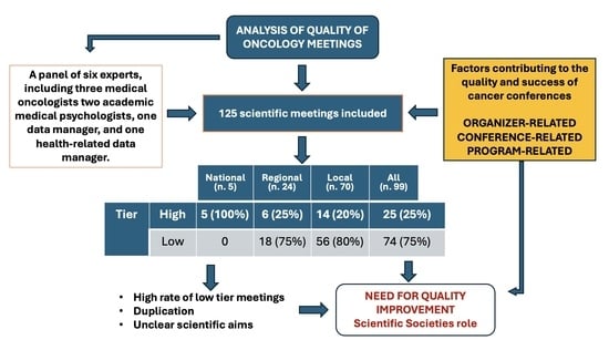 Background: In recent years, the rapid advances in molecular biology and cancer pathophysiology, and the rapid availability of new therapeutic agents, have led to an exponential increase in the number of medical oncology conferences. This plethora may partly result from excessive duplication, undertaken without scientific or updating aims, under pressure from sponsors or other motivations unrelated to scientific advancement. The quality of meetings is therefore to be analyzed. Methods: A panel of medical oncologists, psychologists, and health-related data managers reviewed the characteristics of 99 out of 125 medical oncology conferences. The meetings were assessed for quality using a 0–5 score based on five parameters: attendees-to-speaker ratio, speaker quality, adequate time allocated for discussion, availability of feedback, and fairness of speeches. Results: The panelists identified 25 of 99 scientific events (25%; 95% CI 17–35%) at the 75th percentile and classified them as high-tier meetings, with a total score of 4–5. There were 5 national conferences, 6 regional conferences, and 14 local conferences. Forty-five meetings (56%; 95%Cl 35–56%) reached a score of 0–2 and twenty-nine (29%; 95%Cl 21–39%) a score of 3, and all were considered low tiers. This difference was statistically significant (p = 0.002709) in favor of high-titer national conferences. Conclusions: Although this paper has several limitations, the results indicate that many conferences were of moderate to poor quality, with a significant prevalence of low-tier events at regional and local levels and a higher concentration of low-tier events within this group. Scientific societies should implement adequate countermeasures.