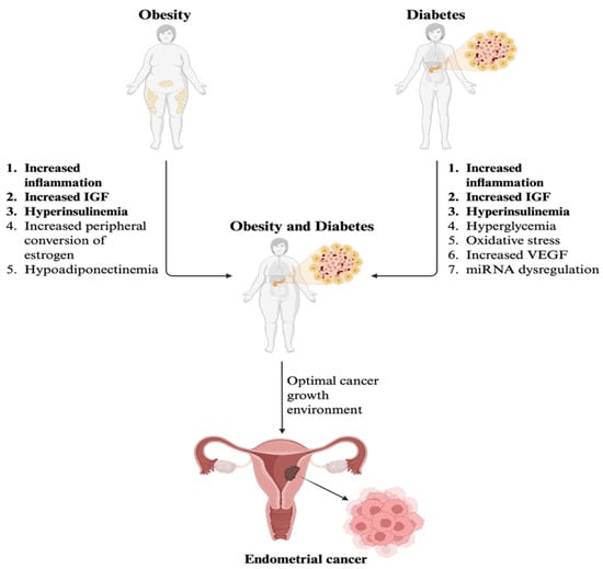 Endometrial cancer is the fourth most diagnosed cancer in U.S. women. Diabetes and obesity are established independent risk factors for EC, but their combined effect is less defined. This review investigates the literature on these comorbidities as risk factors and modifiers of EC.