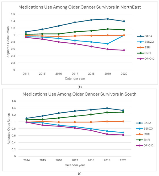 Opioids and benzodiazepines (BZD) are commonly prescribed for older cancer survivors with co-occurring pain and anxiety. The prescribing rate of gabapentinoids (GABA), Selective Serotonin Reuptake Inhibitors (SSRIs), and Serotonin-Norepinephrine Reuptake Inhibitors (SNRIs) in the general population has increased as opioid/BZD alternatives, but little is known on temporal/regional trends in use of these alternatives among older cancer survivors. A retrospective cohort study using SEER-Medicare data was conducted. Patients aged ≥ 66 years, diagnosed with breast, colorectal, prostate, or lung cancer as their first cancer diagnosis any time from 2000 to 2015 and who were alive more than 5 years after cancer diagnosis, were eligible for inclusion. Temporal trends varied by region (p < 0.0001) and opioid-naïve status (p < 0.0001). Compared to 2013, GABA and SNRI use increased, while BZD and opioid use decreased. All regions experienced declines in opioid use. From 2013 to 2018, all regions saw an increase in GABA use, with a decline in 2020. GABA prescriptions increased more in opioid-naïve groups compared to non-opioid-naïve patients. The yearly trends in GABA and SSRI/SNRI use varied by region among older cancer survivors. Clinical practice variation suggests needs for further research on improving consistency and quality of cancer care.