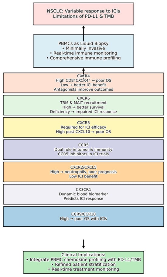 Non-small cell lung cancer (NSCLC) remains a leading cause of cancer-related mortality globally. The advent of immune checkpoint inhibitors (ICIs) has significantly improved outcomes for a subset of patients; however, predictive biomarkers to identify responders are still lacking. Peripheral blood mononuclear cells (PBMCs) offer a minimally invasive means to assess systemic immune status and have emerged as a potential source of predictive biomarkers. Recent studies have highlighted the role of chemokines and their receptors in modulating immune responses against tumors. In particular, the expression levels of chemokine receptors such as CXCR4 on PBMCs have been associated with patient responses to ICIs. The differences in expression of these receptors correlates with enhanced T cell trafficking and infiltration into the tumor microenvironment, leading to improved antitumor activity. This review consolidates current evidence on the prognostic and predictive value of chemokine receptor expression in PBMCs, like T cells, for NSCLC patients treated with ICIs. Understanding these associations can aid in the development of non-invasive biomarkers to guide treatment decisions and improve patient stratification in immunotherapy.