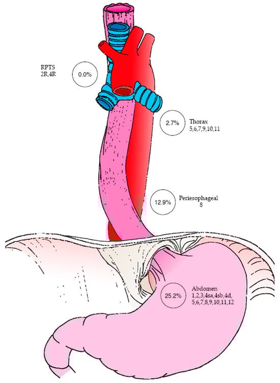 The benefit of extensive lymphadenectomy including the right paratracheal station (RPTS) in the upper mediastinum for esophagogastric junction (EGJ) adenocarcinoma remains controversial. Upper mediastinal lymph node (LN) involvement has been associated with esophageal invasion length, representing a potential research area. This study aimed