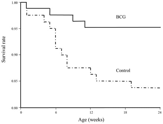 Bovine tuberculosis (bTB) is mainly caused by Mycobacterium bovis, which affects cattle, leading to significant economic losses. In Chile, the vaccination with the M. bovis Bacillus Calmette-Guérin (BCG) strain has been implemented in dairy herds with high prevalence of bTB. This study evaluated non-specific protection associated with BCG on the detection of pathogen-associated genes (nsp5, stx1, stx2, invA, IS1081) and mortality related to diarrhea and pneumonia in calves. A total of 186 calves from a commercial dairy farm were enrolled and grouped as vaccinated (n = 96) and non-vaccinated (n = 90). The BCG Russia strain (2–5 × 105 UFC) was inoculated subcutaneously within the first 30 days after birth. Animals were monitored through fecal sampling at 3 and 6 months of age for molecular detection of gene sequences. A logistic regression analysis showed differences in detection rates of the stx1 sequence at 3 months, with a higher risk for the non-vaccinated individuals (OR 2.91, CI 1.42–5.94, p = 0.03) and for those born in the cold season (OR 9.55, CI 2.02–45.11, p = 0.004). A Kaplan–Meier survival analysis showed a significant difference in deaths in vaccinated calves compared with non-vaccinated animals (p = 0.018), suggesting that BCG confers non-specific protection during the first 3 months after birth, in field conditions.