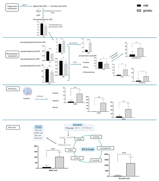 Fermented dairy products such as yogurt, kefir, and traditional cheeses are increasingly consumed worldwide for their nutritional and probiotic properties. Lipidomic profiling provides valuable insights into microbial-driven biochemical changes during fermentation. In this study, we performed a comprehensive untargeted lipidomic analysis of sheep milk and Gioddu, a traditional Sardinian fermented dairy product. Using UHPLC-QTOF-MS platform, we observed that fermentation significantly reshaped the lipidome. Gioddu samples showed higher levels of phosphatidylethanolamines (PE) and lysophosphatidylethanolamines (LPE), together with a pronounced reduction in sphingolipids (glucosylceramides, ceramides, sphingomyelins) and glycerophospholipids (phosphatidylinositols, phosphatidylserines, phosphatidylcholines) compared to sheep milk. These findings align with known enzymatic activities of lactic acid bacteria (LAB), including phospholipases A1 and A2, phosphatidylinositol-specific phospholipase C (PI-PLC), and sphingomyelinase. Fermentation also affected triglycerides, with reduced levels of FA 18:1-containing species, suggesting the selective lipolysis of monounsaturated fatty acids by microbial lipases. Complementary metabolomic profiling revealed reduced levels of simple sugars such as galactose and inositol in Gioddu samples, consistent with their use as primary carbon sources during early fermentation. Conversely, a marked accumulation of carboxylic acids (succinic, malic, hydroxyisovaleric, hydroxyglutaric, glyceric) was revealed, reflecting enhanced microbial fermentative activity. Increased levels of amino acids, including alanine, serine, proline, and ethanolamine, further highlighted active proteolysis and membrane remodeling driven by LAB metabolism. These findings show that LAB enzymes play a key role in modifying the lipidome of fermented dairy products, highlighting their metabolic flexibility and potential impact on nutritional and health properties. This integrated approach sheds new light on the metabolic plasticity of fermentative processes and underscores the value of omics-based tools in understanding traditional food systems.