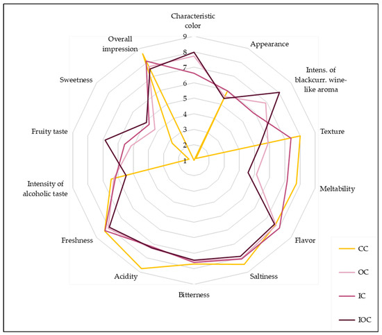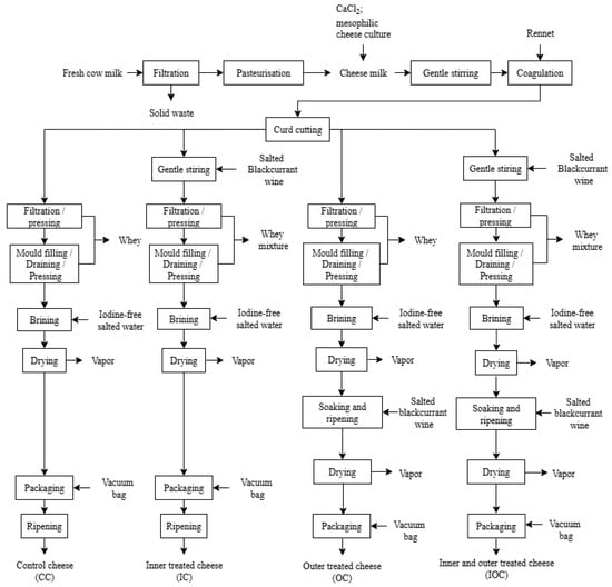 Cheese consumption is steadily increasing worldwide, with a growing interest in cheese enriched with bioactive substances, including antioxidants. This study investigated the impact of adding blackcurrant wine to the curd (IC), enriching the curd with blackcurrant wine by soaking and ripening in salted