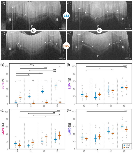 (1) Background/Objectives: Gap formation contributes to the clinical failure of partial crowns. Therefore, it was analyzed at the interfaces between restoration, luting material, and tooth in partial crowns made of lithium disilicate ceramic (LS2) and nanohybrid composite (RBC) after thermomechanical loading (TCML) using optical coherence tomography (OCT). (2) Materials and Methods: Sixteen human mandibular molars were restored with CAD/CAM partial crowns made of LS2 (IPS e.max® CAD) or RBC (Tetric® CAD) using adhesive cementation (Variolink® Esthetic DC). The restorations were imaged by OCT (1550 nm, 28 kHz) at t0 = 24 h, t1 = 90 days of water, t2 = after TCML with 480,000 loading cycles, and t3 = TCML with 1,200,000 loading cycles. Gap lengths (%) at interface 1 (partial crown-luting material) and interface 2 (luting material–enamel/dentin) were quantified. Groupwise and pairwise comparison of OCT parameters was conducted using the Mann–Whitney U, Friedman, and Conover–Iman tests with Bonferroni correction (α = 0.05). (3) Results: At interface 1, LS2 showed a larger median gap length than RBC (ceramic = 48.4%; composite = 5.2%, p < 0.01). At interface 2, the largest median gap length for LS2 was measured at the dentin (ceramic = 59.7%; composite = 52.5%), while for RBC, the enamel was more affected (ceramic = 26.2%; composite = 36.9%). (4) Conclusions: OCT enables reliable gap detection in partial crowns under functional loading and is therefore suitable for monitoring adhesive interface integrity. Under in vitro conditions, both materials demonstrated stable adhesive performance without debonding, while material-dependent differences in gap formation and distribution were observed.