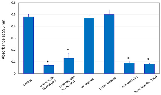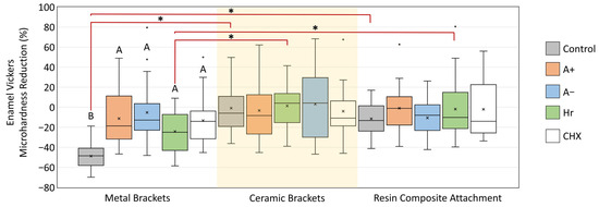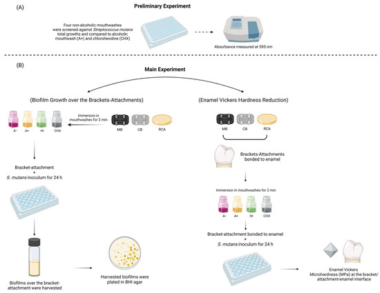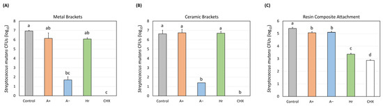 Background/Objectives: Chlorhexidine (CHX) and alcoholic (A+) mouthwashes are associated with adverse oral effects. Therefore, this study compared the efficacies of non-alcoholic mouthwashes, including fluoride (A−) and herbal (Hr) rinses, for preventing bacterial accumulation and enamel demineralization around metal brackets (MBs), ceramic brackets (CBs),