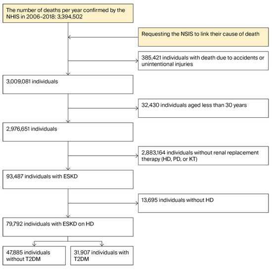 Background/Objectives: Diabetic nephropathy is the leading cause of end-stage kidney disease (ESKD) worldwide. ESKD individuals with type 2 diabetes are known to have poor prognosis of survival. We aimed to investigate whether the recent mortality trends of ESKD individuals treated with hemodialysis with