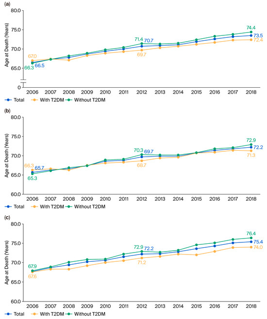 Background/Objectives: Diabetic nephropathy is the leading cause of end-stage kidney disease (ESKD) worldwide. ESKD individuals with type 2 diabetes are known to have poor prognosis of survival. We aimed to investigate whether the recent mortality trends of ESKD individuals treated with hemodialysis with or without type 2 diabetes have changed in South Korea. Methods: We used a cohort of 3,394,502 deceased people from the Korean National Health Insurance Service claims database from 2006 to 2018. We requested the National Statistical Information Service database to link the records about their cause of death. We collected a total of 79,792 deaths among individuals with ESKD receiving hemodialysis, including 31,907 with type 2 diabetes and 47,885 without type 2 diabetes. Results: The mean age at death significantly increased over the study period among individuals with ESKD receiving hemodialysis, both with and without type 2 diabetes (p < 0.001). However, the mean age at death was consistently lower in those with type 2 diabetes compared to those without diabetes in both men and women. Type 2 diabetes was significantly associated with younger age at death in individuals undergoing hemodialysis (β = −0.012, p < 0.0001). The age-standardized mortality rate remained higher in those with type 2 diabetes throughout the study period. Conclusions: This nationwide study revealed that Korean individuals with type 2 diabetes undergoing hemodialysis had a consistently lower age at death and higher age-standardized mortality than those without type 2 diabetes. Although the mean age at death increased in both groups, individuals undergoing hemodialysis with type 2 diabetes continued to show poorer survival outcomes. These findings highlight the need for targeted clinical approaches to improve survival in this high-risk population.