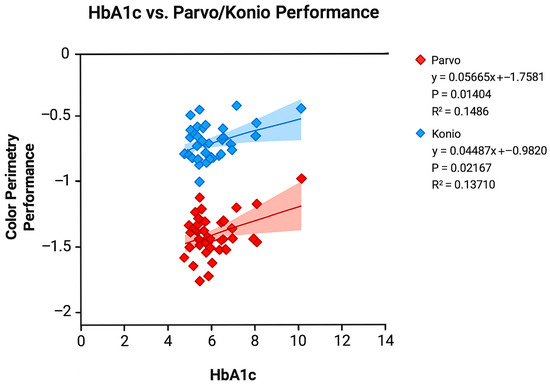 Background/Objectives: Type 2 diabetes (T2DM) is a leading cause of vision loss. Functional measurements (color vision and contrast sensitivity) are sensitive to early changes in eyes even before retinopathy is present. This study evaluates a novel color perimetry device as an indicator of diabetic eye disease. Methods: 40 (age-matched) subjects were divided into three groups by HbA1c or previous diagnosis (control ≤ 5.6%, prediabetes 5.7–6.4%, and diabetes ≥ 6.5%). Additional health metrics gathered included BMI, body fat %, total cholesterol, HDL/LDL levels, blood glucose, and blood pressure. Novel color perimetry which measures chromatic thresholds at four locations, three degrees from the fovea, for five colors (achromatic, red, green, blue, and yellow) was completed. Mars contrast and L’Anthony D15 color testing were also completed. Lens photos excluded those with cataracts. Results: There were differences between the groups for HbA1c (p < 0.001), BMI (p = 0.046), body fat % (p = 0.020), and color perimetry for the yellow condition only (p = 0.013). The achromatic condition was highly associated with Mars contrast sensitivity (p < 0.001). HbA1c was associated with both parvocellular (average of red and green) (p = 0.014) and koniocellular (average of blue and yellow) color perimetry performance (p = 0.022). Conclusions: HbA1c is associated with color perimetry across both retinal pathways. The yellow condition in particular holds promise as a biomarker for the presence of functional changes in diabetes prior to the onset of retinopathy. Other health metrics did not influence chromatic thresholds. More research needs to be conducted to evaluate color perimetry in these patient groups to understand these relationships.