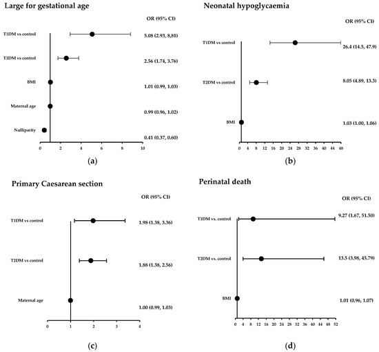 Background/Objectives: Previous studies have examined perinatal outcomes in women with type 1 (T1DM) or type 2 diabetes (T2DM) in pregnancy compared with the general population, but few have directly assessed the impact of T1DM and T2DM on pregnancy outcomes both against each other