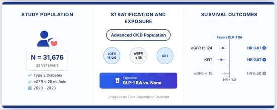 Background/Objectives: In populations with type 2 diabetes mellitus (T2DM), it is unknown whether the survival benefits of glucagon-like peptide-1 receptor agonists (GLP-1 RA) differ by estimated glomerular filtration rate (eGFR). To address this question and in the absence of definitive randomized controlled trials, we performed a retrospective observational study of US Veterans with T2DM to evaluate mortality hazard ratios associated with GLP-1 RA use at different eGFR levels. Methods: This administrative claims-based cohort included 1,188,052 U.S. Veterans with T2DM as of 1 January 2020. Initiation of GLP-1 RA was treated as a time-dependent variable and vital status of Veterans was followed until 31 December 2023. Results: A total of 31,676 Veterans met inclusion criteria. Over the study timeframe, 6.1% initiated treatment with GLP-1 RA and 57.7% died. Older age and eGFR < 15 mL/min/1.73 m2 were associated with a decreased likelihood of GLP-1 RA initiation. In contrast, younger age and lower comorbidity burden were associated with decreased mortality, a finding that persisted even after adjustment for several baseline covariates. Conclusions: Among those with T2DM and eGFR < 25 mL/min/1.73 m2, initiation of GLP-1 RA was associated with improved survival. This association remained significant with decreasing levels of kidney function, as well as among those receiving kidney replacement therapy (KRT). In conclusion, longer survival was observed both in participants on KRT and in those with eGFR 15–24 mL/min/1.73 m2 not on KRT, but these findings were not observed among those with eGFR ≤ 15 mL/min/1.73 m2.