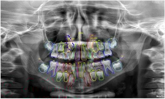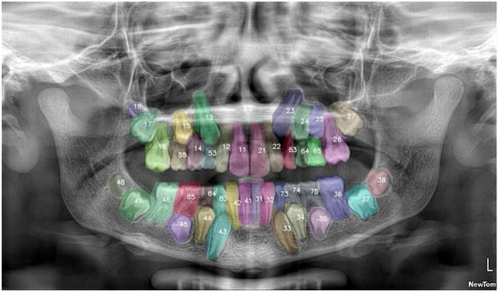 Background/Objectives: Accurate identification of deciduous and permanent teeth on panoramic radiographs (PRs) during mixed dentition is fundamental for early detection of eruption disturbances, yet relies heavily on clinician experience due to developmental variability. This study aimed to develop a deep learning model