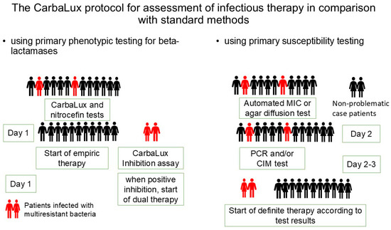 Background/Objectives: In this proof-of-concept study, the objective was to evaluate the phenotypic CarbaLux combination rapid test in terms of guiding the therapy of infections caused by multidrug-resistant Gram-negative bacteria with carbapenemase inhibitors and carbapenems, and to compare its results and practicability with standard