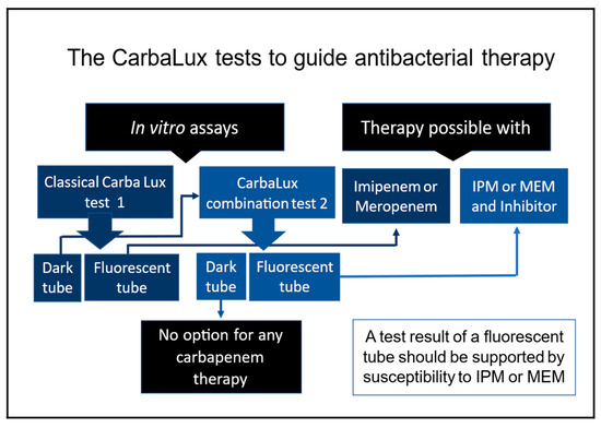 Background/Objectives: In this proof-of-concept study, the objective was to evaluate the phenotypic CarbaLux combination rapid test in terms of guiding the therapy of infections caused by multidrug-resistant Gram-negative bacteria with carbapenemase inhibitors and carbapenems, and to compare its results and practicability with standard diagnostic methods. Methods: In the classical CarbaLux test, a fluorescent carbapenem serves as a UV–visible diagnostic surrogate for clinically used carbapenem antibiotics. When exposed to extracted carbapenemases from bacterial colony growth on agar plates, fluorescence rapidly disappears, showing whether monotherapy with carbapenems is possible or must be rejected. It was expected that a specific inhibitor that protects imipenem or meropenem from enzymatic deactivation during antibacterial therapy would perform the same in vitro with fluorescent carbapenem and preserve its fluorescence. The new additional CarbaLux combination test is used if the classic test is positive for carbapenemases: a classic test tube pre-dosed with fluorescent carbapenem is spiked with cloxacillin; with recently launched carbapenemase inhibitors, e.g., avibactam, relebactam, zidebactam, nacubactam, or vaborbactam; or with picolinic acid. Fourteen Enterobacterales and six Acinetobacter baumannii isolates were analyzed. Results: At fixed concentrations, the new inhibitors protected fluorescent carbapenem from bacterial KPC-mediated inactivation and partially from AmpC beta-lactamase-mediated inactivation. In addition, avibactam also effectively inhibited OXA-48-like enzymes. Cloxacillin selectively inhibited AmpC beta-lactamases extracted from Enterobacter complex species. Non-therapeutic picolinic acid was specific for metallo-beta-lactamases and thus identified infections by pathogens that cannot be treated with carbapenems alone or in combination. Conclusions: Inhibitor/fluorescent carbapenem mixtures corresponding to therapeutic inhibitor/carbapenem combinations allow us to visualize the efficacy of carbapenemase inhibitors. The in vitro results are consistent with clinical experience regarding combination therapy. Enzymatic assays provide a rapid yes/no answer for carbapenem mono- or combination therapy and offer several advantages over current carbapenemase testing methods. In contrast to PCR and lateral flow tests, which only target a selection of carbapenemases, enzymatic assays work by employing a reproducible phenotypic mechanism. They are simpler, broader in scope, and more cost-effective; they can also detect antimicrobial heteroresistance or AmpC beta-lactamase hyperproduction, which is normally undetected when performing automated antibiotic susceptibility testing. The new tests are suitable for clinical diagnosis, public health purposes, and infection control.