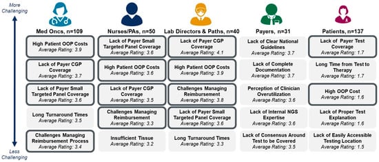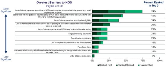 Background/Objectives: Next-generation sequencing (NGS)-based molecular profiling has revolutionized personalized medicine and unlocked new treatment options for cancer patients. Clinical guideline bodies agree that patients diagnosed with HR+/HER2− metastatic breast cancer (mBC) may benefit from comprehensive somatic genomic profiling to identify candidates for established targeted therapies and clinical trials, yet many patients are not receiving it due to a lack of widespread access to NGS. Methods: To better understand the perceived barriers (if any) to NGS tests in mBC, a study was conducted across multiple stakeholders including medical oncologists, nurses, physician assistants, lab directors, pathologists, payers, and patients. Results: This study revealed that despite the awareness and recognition of the value proposition of NGS-based molecular profiling in mBC, inconsistent payer coverage, high out of pocket costs for patients, and challenges in managing reimbursement and prior authorization processes can lead to suboptimal utilization of NGS, which can subsequently lead to suboptimal treatment decisions where approved therapies exist. Interestingly, many payers (33%) were not aware of the current somatic biomarker testing recommendations from NCCN guidelines. As a result, payers identified the lack of clear clinical guidelines (74% ranked as top 3), the lack of internal consensus on which NGS tests to cover (45%), and the absence of internal expertise on NGS (39%) as the primary hurdles for broader NGS access. Conclusions: The results suggest that widespread HCP and payer education on clinical guidelines (e.g., NCCN) and utility for targeted therapy selection is crucial for enhanced adoption of NGS-based molecular profiling in mBC.