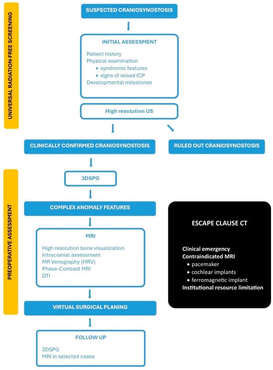 Background/Objective: Craniosynostosis, the premature fusion of one or more cranial sutures, is the second most common craniofacial defect and poses significant diagnostic and therapeutic challenges. Our objective was to systematically evaluate current diagnostic imaging modalities for craniosynostosis and to propose a novel radiation-free