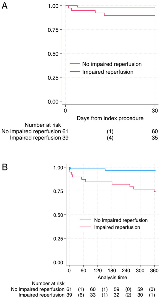 Background: The no-reflow phenomenon remains a frequent and clinically significant complication in patients with ST-segment elevation myocardial infarction (STEMI) despite advances in primary percutaneous coronary intervention (pPCI). Its determinants are multifactorial and not fully established. This study aimed to identify independent predictors of impaired reperfusion after pPCI. Methods: In this prospective study, 100 consecutive STEMI patients treated with successful pPCI in a high-volume tertiary center were analyzed. Impaired reperfusion was defined as ST-segment resolution < 50% or final TIMI flow < 3. Clinical characteristics, laboratory findings, including platelet reactivity, and detailed angiographic and procedural parameters were collected. Independent predictors were evaluated using multivariable logistic regression. Thirty-day and twelve-month mortality were assessed with Kaplan–Meier analysis. Results: Impaired reperfusion occurred in 39% of patients. Compared with the normal reperfusion group, patients with noreflow were older, had lower left ventricular ejection fraction, eGFR, longer ischemia times, and more often presented with anterior STEMI. Platelet reactivity did not differ between groups. Four variables independently predicted impaired reperfusion: longer pain-to-balloon time (OR 1.05 per 10 min, 95% CI 1.02–1.07; p < 0.001), anterior myocardial infarction (OR 5.05, 95% CI 1.14–22.38; p = 0.03), use of predilatation (OR 7.66, 95% CI 1.78–32.9; p = 0.006), and higher Killip–Kimball class (OR 7.69, 95% CI 1.88–31.38; p = 0.004). Impaired reperfusion was associated with significantly higher mortality at 30 days (1.6% vs. 10%; p < 0.001) and 12 months (3.2% vs. 25.6%; p < 0.001). Conclusions: In this prospective STEMI cohort, impaired reperfusion was frequent and strongly associated with adverse short- and long-term outcomes. Ischemia duration, infarct location, hemodynamic status, and procedural strategy were key determinants of noreflow, while platelet reactivity showed no significant association.