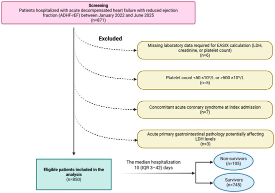 Background: Early risk stratification in acute decompensated heart failure with reduced ejection fraction (ADHF-rEF) remains challenging. The Endothelial Activation and Stress Index (EASIX)—a composite of lactate dehydrogenase, creatinine, and platelet count—reflects endothelial dysfunction, a pathophysiological contributor to early deterioration in ADHF-rEF. This study