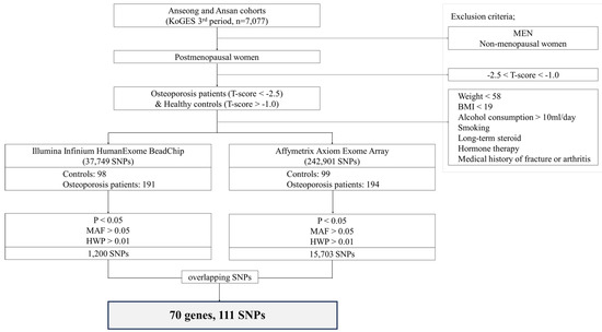 Background: Osteoporosis is highly prevalent in postmenopausal women, yet genome-wide association studies often miss disease-relevant variants because of incomplete single nucleotide polymorphism (SNP) coverage and platform-specific limitations. We aimed to identify genetic contributors to osteoporosis risk by integrating two exome-based genotyping platforms with