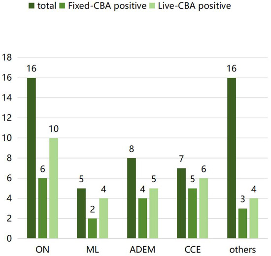 Background and Objective: Myelin oligodendrocyte glycoprotein (MOG) antibody-associated disease (MOGAD) is a significant component of demyelinating diseases in pediatric populations. Recently, diagnostic criteria for MOGAD were established. This study aims to evaluate and compare the diagnostic efficacy of the fixed-cell-based assay (Fixed-CBA) and the live cell-based assay (Live-CBA) in patients who meet the 2023 clinical diagnostic criteria for MOGAD. Methods: This retrospective study included patients suspected of having MOGAD who were enrolled between June 2023 and June 2024. Patients were selected based on the “core clinical demyelinating events” outlined in the 2023 proposed criteria of the International MOGAD Panel. Patients with multiple sclerosis (MS), neuromyelitis optica spectrum disorders (NMOSD) with aquaporin-4 antibody-positive (AQP4-Abs-positive), and non-central nervous system (non-CNS) inflammatory diseases were chosen as controls. Serum samples were simultaneously tested for MOG-Abs using Fixed-CBA and Live-CBA. Results: A total of 86 patients were enrolled in the study: 52 in the suspected MOGAD group and 34 in the control group. Out of these patients studied, 16 presented with optic neuritis (ON), 5 with myelitis, 8 with acute disseminated encephalomyelitis (ADEM), and 7 with cortical encephalitis. Sixteen patients could not be classified by clinical phenotype. The highest MOG-Ab positivity rate was among patients with cortical encephalitis [85.7% (Live-CBA)/71.4% (Fixed-CBA)]. Both assays identified 22 positive samples, with Fixed-CBA and Live-CBA sensitivities at 44.2% and 55.8%, respectively, and a specificity of 97%. Of the patients suspected of having MOGAD, 19 cases were confirmed using the Fixed-CBA, while 28 cases were confirmed using the Live-CBA. This resulted in an upgrade in diagnostic classification for nine cases. This led to a diagnostic reclassification in nine cases. Conclusions: Both the Fixed-CBA and Live-CBA were associated with higher sensitivity for patients selected based on the 2023 MOGAD clinical diagnostic criteria. The Live-CBA exhibited an 11.6% increase in sensitivity, contributing to a 17.3% (9/52) enhancement in clinical diagnostic accuracy.