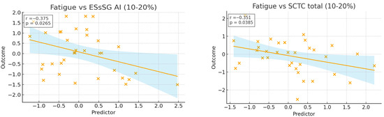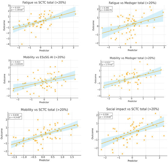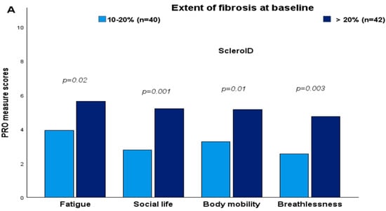 Background/Objective: Pulmonary involvement in systemic sclerosis (SSc) is typically assessed using pulmonary function tests (PFTs), high-resolution CT (HRCT), and composite indices. Patient-reported outcomes (PRO), including ScleroID, provide insight into quality of life, but their relationship with clinical measures and role in overall disease assessment remain unclear. To assess the correlation between ScleroID scores and both lung involvement and disease activity/damage in a cohort of SSc-ILD patients from a large tertiary care center. Methods: Disease activity [European Scleroderma Study Group Activity Index (EScSG-AI), Scleroderma Clinical Trials Consortium Activity Index (SCTC-AI)], disease severity [Medsger severity scale (MSS)], and PRO measure ScleroID were assessed for associations with the extent and severity of SSc-ILD. Results: In 82 patients with SSc-ILD (mean age 56.0 ± 10.8 years; median disease duration 4.2 ± 4.7 years), higher fibrosis extent (>20%) was associated with worse lung function, greater exercise limitation, and higher ScleroID scores, particularly in fatigue, social life, and body mobility domains (all p ≤ 0.03). Patients with >20% fibrosis also had worse NYHA class and Borg scores during 6-MWD (p < 0.001). Cross-sectional correlations showed that ScleroID total and individual domains were negatively associated with FVC% and 6-MWD, and positively with ILD extent on HRCT. Fatigue, social impact, and mobility domains correlated most strongly with disease activity and severity scores, especially in patients with > 20% fibrosis (r = 0.384–0.635, all p ≤ 0.016), whereas breathlessness showed minimal associations (r < 0.2). Conclusions: In SSc-ILD, greater lung fibrosis and functional impairment are associated with worse patient-reported quality of life, particularly in fatigue, mobility, and social domains. ScleroID scores reflect both physiological severity and disease burden highlighting its value as a multidimensional outcome measure in patients with more advanced disease.