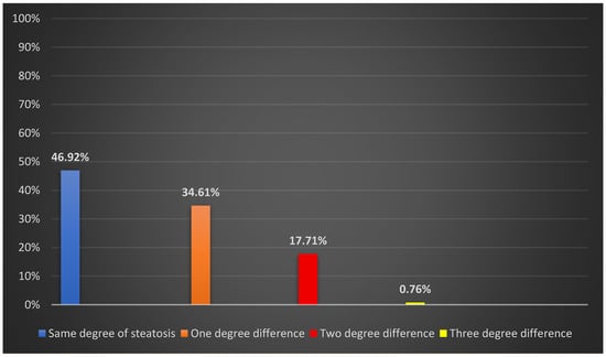 Background: Discrepancies are frequently observed between liver steatosis grading assessed by conventional B-mode ultrasonography and vibration-controlled transient elastography (VCTE) with controlled attenuation parameter (CAP). This study aimed to identify factors associated with these differences and to evaluate whether the two imaging methods provide comparable steatosis classifications. Methods: We conducted a retrospective cross-sectional observational study including 130 hospitalized patients evaluated over a two-year period who underwent laboratory testing, abdominal ultrasonography, and transient elastography. The analyzed variables included demographic characteristics, nutritional status, comorbidities, and biochemical parameters such as alanine aminotransferase (ALAT), total cholesterol, triglycerides, gamma-glutamyl transferase (GGT), and the fibrosis-4 index (FIB-4). Patients were classified into two groups: concordant steatosis grading between the two methods (n = 61) and discordant results (n = 69). Results: Concordant steatosis grading was more frequently observed in patients with serum total cholesterol > 200 mg/dL (45.9%) and FIB-4 values between 1.45–3.25 (44.2%). A trend toward higher concordance was also observed in patients with elevated triglycerides. In contrast, viral liver disease was significantly associated with discordant results (26.2%). Higher fibrosis stages assessed by VCTE (F ≥ 2) and FIB-4 values > 3.25 showed a non-significant trend toward discordance. Conclusions: Several clinical and biochemical factors influence the agreement between ultrasound and VCTE-based CAP in the assessment of hepatic steatosis. Elevated cholesterol and intermediate FIB-4 values were associated with concordant results, whereas viral liver disease was associated with discordance between the two imaging modalities.