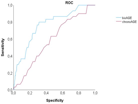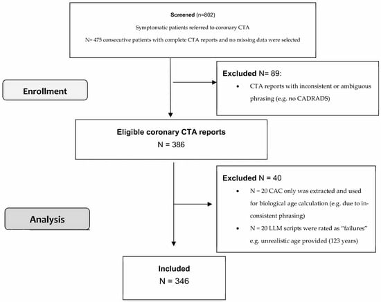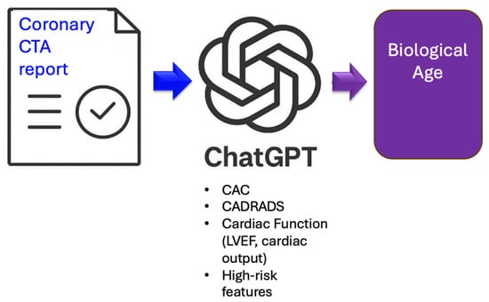 Background/Objectives: Coronary artery disease (CAD) remains the leading cause of death worldwide. Traditional cardiovascular risk assessment is based on chronological age and other clinical factors, with inherent limitations and poor accuracy. Objective was to estimate the artificial intelligence (AI)-enhanced biological cardiovascular age calculation derived from coronary computed tomography angiography (CTA) reports using a large language model (LLM), in predicting major adverse cardiovascular events (MACE). Methods: Coronary CTA reports were analyzed using a LLM (ChatGPT-4.0v, OpenAI), from symptomatic patients with suspected CAD who underwent coronary CTA for clinical indications. Patients in which the LLM successfully analyzed the key metrics (1) coronary artery calcium (CAC) score and (2) coronary CTA reports (coronary stenosis severity (CAD-RADS), high-risk anatomy, non-calcified plaque, cardiac function (LVEF and others) were included. Results: 386 CTA reports were uploaded, and 346 (89.6%) included. The mean biological age (bioAGE) was 57.2 ± 10.9 and the chronological 58.5 ± 10.8 years. 137 (39.6%) were women. The intra-individual deviation in bioAGE was high (median: 8.8; IQR 9.98). BioAGE exceeded chronological age in 45.4% patient and was lower or equal in 54.6%) MACE rate was 8.7% comprising 2 deaths, 5 myocardial infarctions, and 22 late revascularizations. The accuracy for prediction of MACE was higher for bioAGE (c = 0.768; 95% CI: 0.681–0.855, p < 0.001) compared to chronological age (c = 0.590; 95% CI: 0.492–0.689, p = 0.102) Conclusions: Biological age calculation from coronary CTA reports using LLM is feasible, yet intra-individual deviations are high. The accuracy for prediction of MACE is improved by bioAGE compared to chronological.