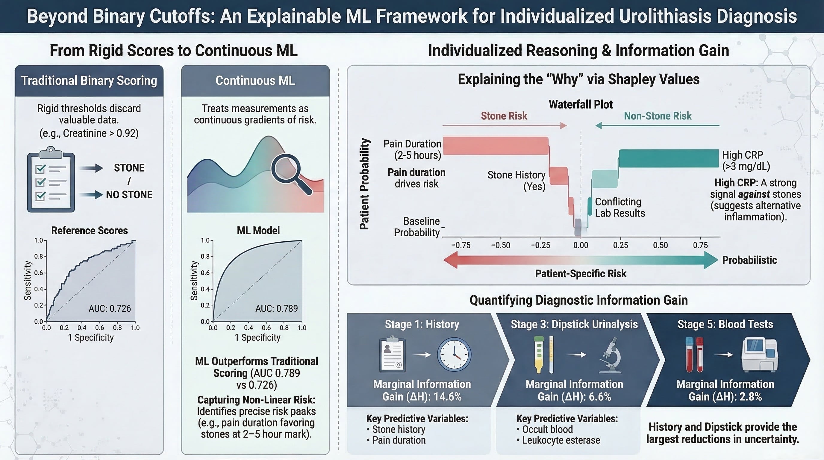 Background: Emergency department evaluation of suspected urolithiasis increasingly relies on non-contrast CT, yet not all patients require imaging. Existing clinical prediction rules help stratify stone probability, but by converting continuous measurements into fixed binary indicators, they offer little insight into why a particular patient is at risk or how much uncertainty remains after each testing stage—questions that bear directly on individualized diagnostic decisions. Methods: We retrospectively analyzed 1000 ED patients with suspected urolithiasis who underwent non-contrast CT (stone prevalence 85.0%). A gradient boosting classifier was trained on 17 continuous clinical and laboratory features and compared against binary-thresholded counterparts and an established scoring system; the 17-feature model achieved AUC 0.771 (95% CI 0.726–0.813) versus 0.723 (95% CI 0.675–0.771) for the reference score on this cohort (DeLong p = 0.001). Individual predictions were explained using an interventional Shapley value approach, and a Shannon entropy-based framework was applied to quantify the marginal diagnostic contribution of each sequential testing stage. Results: Held-out permutation importance identified red blood cell count on microscopy, age, pain duration, and prior stone history as the most influential predictors. Several features showed non-linear contributions that diverged from conventional binary thresholds: creatinine effect crossed zero near 0.90 mg/dL and pain duration peaked between 2 and 5 h. C-reactive protein, absent from existing scoring systems, emerged as a meaningful negative predictor. Sequential entropy analysis showed that dipstick urinalysis provided the largest marginal information gain among non-history stages (6.1% of prior entropy), while physical examination contributed 2.3%. A prevalence sensitivity analysis projected that the framework’s threshold behavior would differ substantially in lower-prevalence populations, underscoring that the cohort-specific cut-points are not portable decision rules. We therefore position the framework as a reasoning aid that complements clinical judgment and imaging, not as a stand-alone triage tool. Conclusions: Explainable machine learning can address questions that aggregate discrimination metrics cannot: which features drive risk for a given patient, how those effects behave across the continuous measurement range, and how much diagnostic uncertainty each testing stage resolves. The Shapley-based explanations and entropy framework developed here offer a structured approach to individualized diagnostic reasoning in the ED evaluation of suspected urolithiasis, functioning as an interpretive adjunct to, rather than a replacement for, existing clinical tools and CT imaging.
