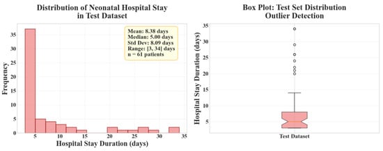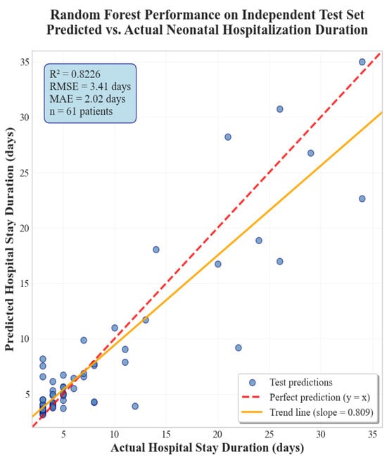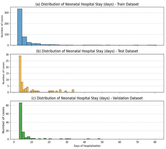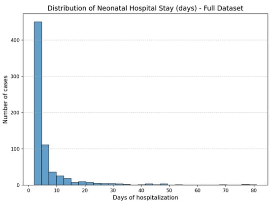 Background/Objectives: The management of high-risk pregnancies remains a major clinical challenge, particularly regarding the optimal timing of delivery, which has significant implications for both perinatal outcomes and healthcare costs. In this context, computerized cardiotocography (cCTG) offers an objective, non-invasive and cost-effective method for fetal surveillance, providing quantitative measures of heart rate dynamics that reflect autonomic regulation and oxygenation status. This study aimed to develop and validate regression-based machine learning models capable of predicting the duration of neonatal hospitalization—an objective and quantifiable indicator of neonatal well-being—using cCTG parameters obtained outside of labor, binary clinical variables describing the presence or absence of pregnancy pathologies, and gestational age at monitoring and at delivery. Methods: A total of 694 singleton high-risk pregnancies complicated by gestational diabetes, preexisting diabetes, intrahepatic cholestasis of pregnancy, pregnancy-induced or preexisting hypertension, or fetal growth restriction were enrolled. Twenty clinically relevant features derived from cCTG recordings and perinatal data were used to train and evaluate four regression algorithms: Random Forest, CatBoost, XGBoost, and LightGBM against a linear regression model with Ridge regularization serving as a benchmark. Results: Random Forest achieved the highest generalization performance (test R2 = 0.8226; RMSE = 3.41 days; MAE = 2.02 days), outperforming CatBoost (R2 = 0.7059), XGBoost (R2 = 0.6911), LightGBM (R2 = 0.6851) and the linear regression benchmark with Ridge regularization (R2 = 0.5699) while showing a consistent train–validation–test profile (0.9428 → 0.8042 → 0.8226). The error magnitude (≈2 days on average) is clinically interpretable for neonatal resource planning, supporting the model’s practical utility. These findings justify selecting Random Forest as the final predictor and its integration into a clinician-facing application for real-time length-of-stay estimation. Conclusions: Machine learning models integrating cCTG features with maternal clinical factors can accurately predict neonatal hospitalization duration in pregnancies complicated by maternal or fetal disease. This approach provides a clinically interpretable and non-invasive decision support tool that may enhance delivery planning, optimize neonatal resource allocation, and improve perinatal care outcomes.