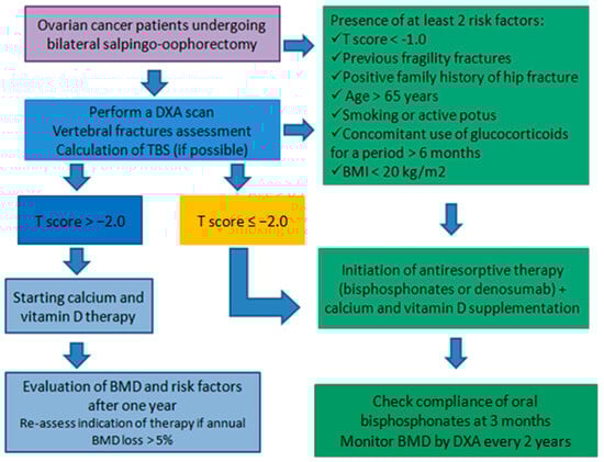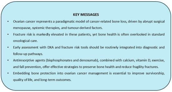 Background/Objectives: Osteoporosis is a prevalent condition characterized by reduced bone mass and microarchitectural deterioration, resulting in increased fracture risk. Ovarian cancer represents a paradigmatic model of cancer-related bone loss, owing to the combined effects of abrupt surgical menopause, chemotherapy, and tumor-driven pro-resorptive