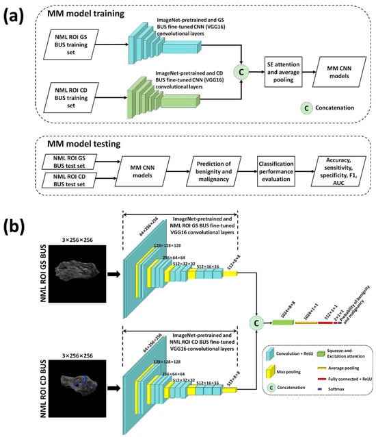 Objectives: To propose a multimodal deep learning method for the classification of benign and malignant breast non-mass lesions (NMLs) using grayscale and color Doppler ultrasound and to compare the performance of multi-modality and single-modality breast ultrasound (BUS) models. Methods: This retrospective study collected