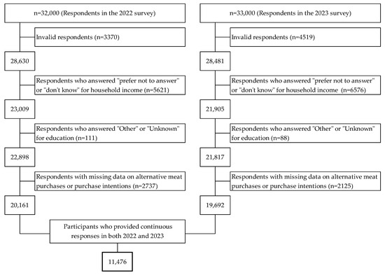 Background: Meat alternative products have gained attention in recent years. This study examined the factors associated with meat alternative purchase in Japan. Methods: This longitudinal study used data from nationwide surveys conducted in 2022 and 2023 with persons aged 15–79 years in Japan. In total, 11,476 participants were included in the analysis. The outcome indicators were changes in meat alternative purchase in 2022 and 2023, categorized into four groups: “no in both years,” “purchased only in 2022,” “purchased only in 2023,” and “purchased in both years.” A multinomial logistic regression model was used, with “no in both years” as the reference group. Potential factors included sex, age, household income, education, health check-up status, and population density in residential areas. Results: Factors that were significantly associated with meat alternative purchase in any year were being woman, being aged <65 years, not having a lower annual income (5–16 million yen), having a higher educational attainment, and having undergone/intended to undergo health check-up (p < 0.05). In particular, sex was significantly associated with “Purchased only in 2022,” “Purchased only in 2023,” and “Purchased in both years”; the multivariate-adjusted OR (95% CI) of “Purchased in both years” for women was 3.07 (2.16–4.34). Conclusion: This study suggests that sociodemographic characteristics may influence the consumption of meat alternatives, impacting the development of the meat alternative industry.