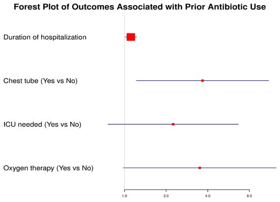 Background: Complicated pneumonia (CP) in children presents in various forms—including empyema, necrotizing pneumonia (NP), necrotizing pneumonia with pleural effusion (NP + PE), and parapneumonic pleural effusion (PPE)—and is associated with significant morbidity despite advances in antimicrobial therapy. This study aimed to describe and compare the clinical characteristics, laboratory findings, antibiotic use, and outcomes across different CP subtypes in hospitalized children and to assess the impact of prior antibiotic use on presentation and treatment outcomes. Methods: This retrospective observational study included 58 children admitted with CP to tertiary hospitals in Jordan. Patients were categorized into four subtypes: empyema (n = 4), NP (n = 4), NP + PE (n = 17), and PPE (n = 33). Demographic data, clinical features, laboratory results, antibiotic regimens, and clinical outcomes were analyzed. Multivariable regression was used to identify predictors of prior antibiotic use. Results: Fever and cough were the most common symptoms (96.6%). Over 40% of patients had received antibiotics prior to admission. Those pre-treated had significantly longer symptom duration (8.2 vs. 4.5 days, p < 0.001), longer hospitalization (18.2 vs. 14.6 days, p = 0.023), and more frequent chest tube insertion (66.7% vs. 35.3%, p = 0.019). Streptococcus pneumoniae was the most common organism isolated in culture-positive cases. Vancomycin-based regimens were the most frequently used treatments. Univariate regression analysis showed that patients with prior antibiotic use had significantly higher odds of longer hospitalization duration (OR = 1.11, p = 0.028) and chest tube insertion (OR = 3.67, p = 0.021). Conclusions: Complicated pneumonia in children remains a diverse and clinically significant condition. The findings demonstrate that prolonged symptom duration prior to hospitalization and certain clinical interventions were associated with prior antibiotic exposure. These results provide insight into local disease patterns and prescribing behaviors, which may help inform strategies to optimize antimicrobial stewardship and improve care pathways for affected children.