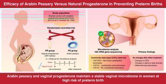 Background/Objectives: Preterm birth (PTB) is a leading cause of neonatal mortality, particularly in women with a short cervix. Vaginal dysbiosis has been associated with increased PTB risk. Progesterone (PR) and Arabin pessary (PE) are commonly used for PTB prevention, but their impact on vaginal microbiome composition is unclear. This study aimed to compare the effects of these interventions on the vaginal microbiome in women at risk of PTB. Methods: In a secondary analysis of a randomized trial at Hospital das Clínicas, Universidade de São Paulo, 203 women with singleton pregnancies and cervical length ≤ 25 mm at the second trimester were assigned to daily vaginal PR (200 mg) or PE. Vaginal swabs from 44 participants (n = 22 per group) were collected at baseline and 4 weeks post-treatment and analyzed via 16S rRNA gene sequencing. Results: From 88 samples analyzed, 80 showed a low-diversity, Lactobacillus-dominated microbiota, 42 classified into Lactobacillus iners-dominated community state type (CST-III), and 38 presented other Lactobacillus species dominance (termed CST-I/II/V). The remaining eight samples presented non-Lactobacillus dominance (CST-IV). Comparing the two groups, no significant changes in CST were observed between sampling timepoints (PE group, p = 0.368; PR group, p = 0.223). Similarly, Shannon alpha diversity did not change (PE group, p = 0.62; PR group, p = 0.30), and Bray–Curtis dissimilarity also did not change after treatment (p = 0.96, before; p = 0.87, after treatment). Conclusions: Arabin pessary and vaginal progesterone maintain vaginal microbiome stability in women at high PTB risk, supporting the microbiological safety of both interventions.