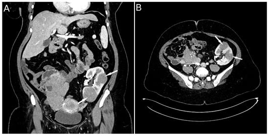 Background/Objectives: Cytomegalovirus (CMV) is an opportunistic pathogen, complicating acute severe ulcerative colitis (ASUC), and its role in ASUC prognosis remains a debate. This study aims to report the rates and identify predictors for colectomy at 12 months, following an episode of ASUC with concomitant CMV colonic infection. Methods: This is a retrospective cohort study of patients with ASUC and CMV colonic infection confirmed by PCR or Immunohistochemistry. Baseline clinical, biochemical, endoscopic and disease-related characteristics were recorded. Patients were followed-up for 12 months to calculate the one-year colectomy rate. Predictors of colectomy were identified via multivariate logistic regression. Results: Forty-five cases of CMV colonic infection in 37 patients with ASUC were recorded [66.7% men, mean age: 47.0 years (SD = 18.5)]. At diagnosis, 20% were on monotherapy with advanced treatment and 37.8% on advanced treatment plus corticosteroids and/or immunomodulators. Twenty-three (51.1%) were receiving corticosteroids, while 17.8% did not receive any immunosuppressive agent. Forty (88.9%) patients were treated with ganciclovir and valganciclovir and one (2.2%) with foscarnet for at least 21 days. Eleven patients (24.4%) required colectomy, two (4.4%) during their initial hospitalization and nine (20%) during the follow-up period. The recurrence of CMV was recorded in nine (20.9%) cases, three of which required colectomy. Patients with hemoglobin < 12 g/dL (p = 0.023) and patients on vedolizumab at diagnosis (p = 0.050) had a higher probability of colectomy. Conclusions: We report a 25% one-year colectomy rate in our cohort with ASUC and superimposed CMV colonic infection. At baseline, anemia and vedolizumab treatment were associated with a higher probability of colectomy.