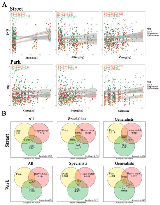 Arbuscular mycorrhizal fungi (AMF) form symbiotic associations with most vascular plants and play an important role in immobilizing heavy metals in soil. Urban green space ecosystems are increasingly affected by heavy metal pollution; however, how different types of green spaces influence AMF diversity, stability, and coexistence mechanisms under heavy metal stress remains unclear. Here, heavy metal-contaminated soil samples were collected from Zhengzhou, China—a large city in the warm temperate monsoon zone of the North China Plain—to conduct high-throughput sequencing and analyze AMF community assembly. (1) AMF community composition varied significantly among green space types, with higher diversity in park green spaces (Shannon = 21.24 ± 2.24) than in street green spaces (Shannon = 11.36 ± 1.17). (2) Heavy metals were the primary factors driving AMF community assembly. Stochastic processes, mainly dispersal limitation, dominated AMF assembly across sites, with a stronger influence in street green spaces. (3) Specialist taxa (mainly Glomus and Claroideoglomus) exhibited higher network connectivity and stability in park green spaces, whereas generalist taxa maintained network resilience in street green spaces. This study elucidates the ecological processes shaping AMF communities in urban ecosystems and provides a scientific basis for AMF-based approaches to heavy metal remediation and sustainable management of urban green spaces.