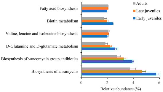 Freshwater mussels hold significant ecological and economic value. Gut bacterial communities can regulate the growth and immunity of freshwater mussels. However, the dynamics of gut bacterial communities in freshwater mussels at different life stages are still limited. This study used the globally widespread mussel, Sinanodonta woodiana, as a model animal and employed 16S rRNA sequencing technology to comparatively analyze the gut bacterial communities of early juveniles, late juveniles, and adults. Alpha diversity indices indicated a trend of increasing richness and diversity of the gut bacterial communities with the mussel growth. Beta diversity analysis revealed distinct stage-specific taxonomic profiles. At the phylum level, four dominant phyla were identified in the early juveniles, namely Fusobacteriota, Verrucomicrobiota, Pseudomonadota, and Cyanobacteriota; and seven dominant phyla were identified in both late juveniles and adults, namely Fusobacteriota, Pseudomonadota, Verrucomicrobiota, Cyanobacteriota, Bacillota, Bacteroidota, and Chloroflexota. Among them, the relative abundance of Fusobacteriota decreased with the mussel growth (p < 0.05), while the relative abundances of Pseudomonadota and Cyanobacteriota increased with the mussel growth (p < 0.05). At the genus level, four dominant genera were identified in the early juveniles: Cetobacterium, LD29, Cyanobium_PCC-6307, and Cupriavidus; seven dominant genera were identified in the late juveniles: Cetobacterium, Roseomonas, LD29, Cyanobium_PCC-6307, Limnolyngbya_CHAB4449, Terrimicrobium, Limnothrix; and nine dominant genera were detected in the adults: Cetobacterium, LD29, Roseomonas, Cyanobium_PCC-6307, Limnothrix, Limnolyngbya_CHAB4449, Sediminibacterium, Terrimicrobium, Acidibacter. Among these, the relative abundance of Cetobacterium decreased with the mussel growth (p < 0.05), while the relative abundance of Acidibacter increased with the mussel growth (p < 0.05). Functional prediction revealed that the gut bacterial communities were primarily involved in metabolic pathways, including the biosynthesis of ansamycins, biosynthesis of vancomycin group antibiotics, D-glutamine and D-glutamate metabolism, biotin metabolism, valine, leucine and isoleucine biosynthesis, and fatty acid biosynthesis. The findings provide insights for enhancing the nutrition and health of freshwater mussels.