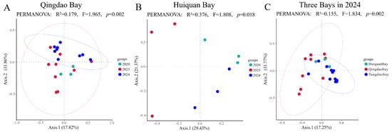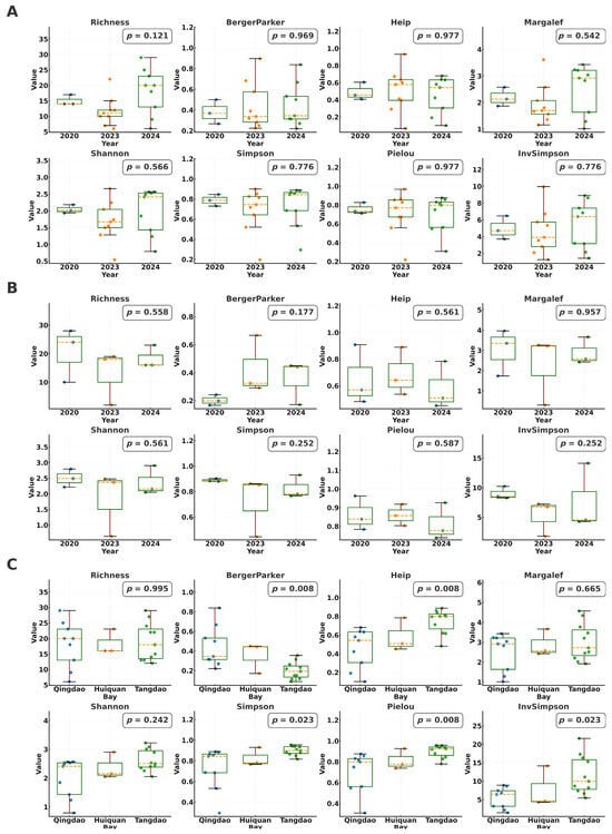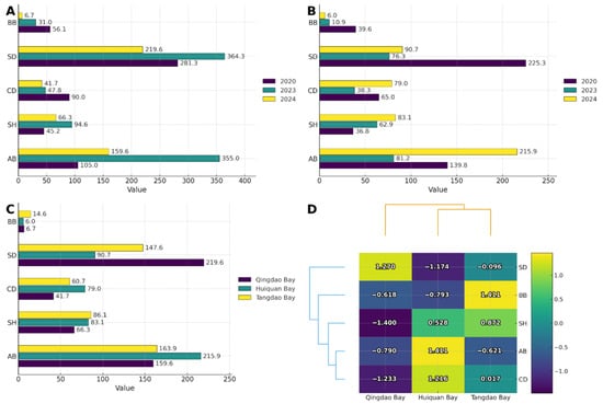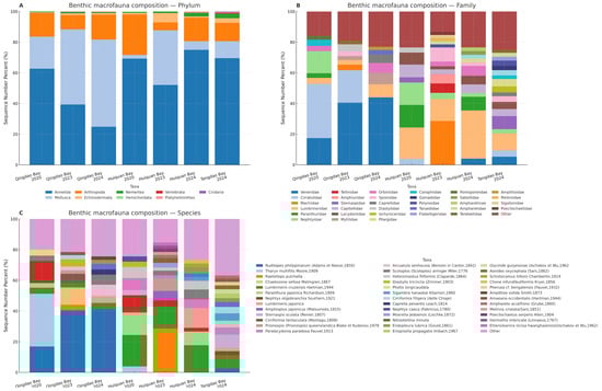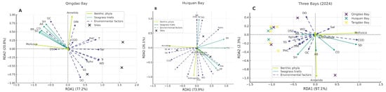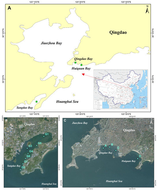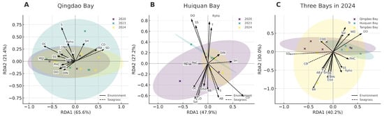 Seagrass beds are among the most productive and ecologically valuable coastal ecosystems. However, temperate nearshore seagrass beds exposed to urban stressors remain understudied. From 2020 to 2024, this study investigated seagrass communities, environmental factors, and benthic macrofauna in Qingdao’s coastal bays (Qingdao Bay,